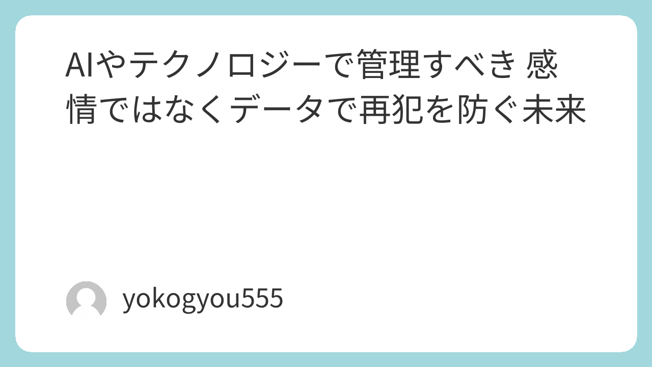 将来的には、AIやテクノロジーを活用した科学的な管理システムが必要になると思います。人間の感情や偏見ではなく、データとアルゴリズムに基づいて、再犯リスクを評価し、適切な支援と監視を行うべきです。GPS追跡、AI による行動分析、ビッグデータを活用したリスク予測など、テクノロジーの力で社会の安全と個人の更生の両方を実現できると考えます。