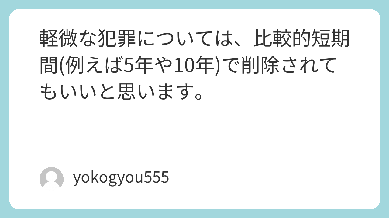 軽微な犯罪については、比較的短期間(例えば5年や10年)で削除されてもいいと思います。