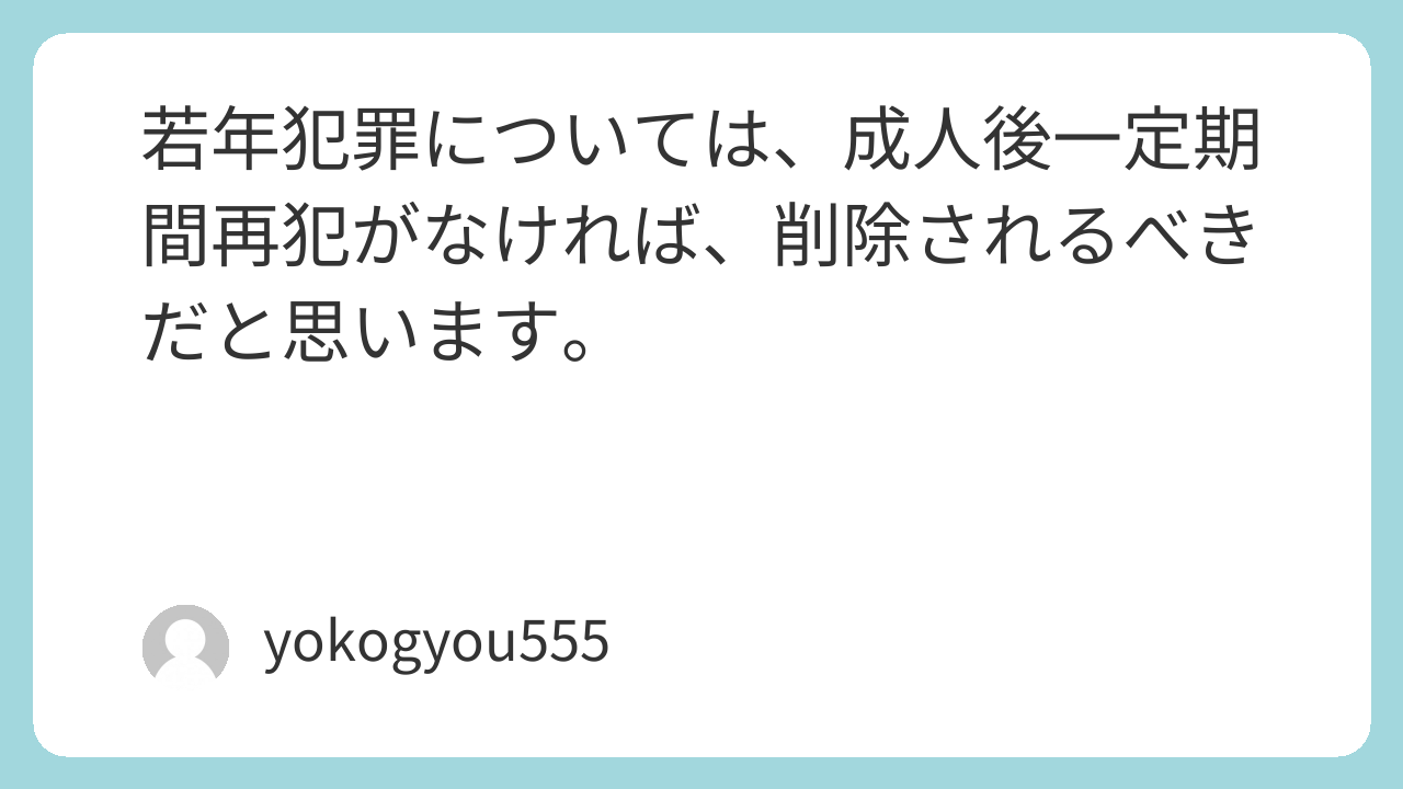 若年犯罪については、成人後一定期間再犯がなければ、削除されるべきだと思います。