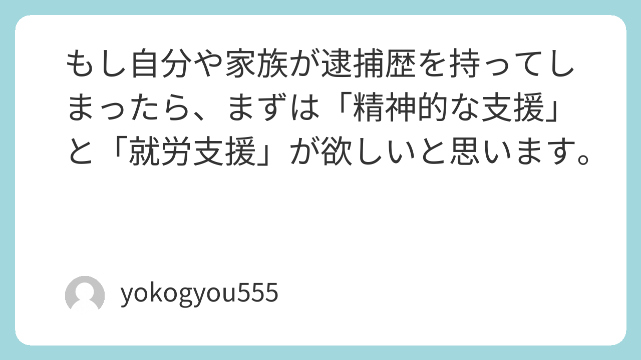 もし自分や家族が逮捕歴を持ってしまったら、まずは「精神的な支援」と「就労支援」が欲しいと思います。