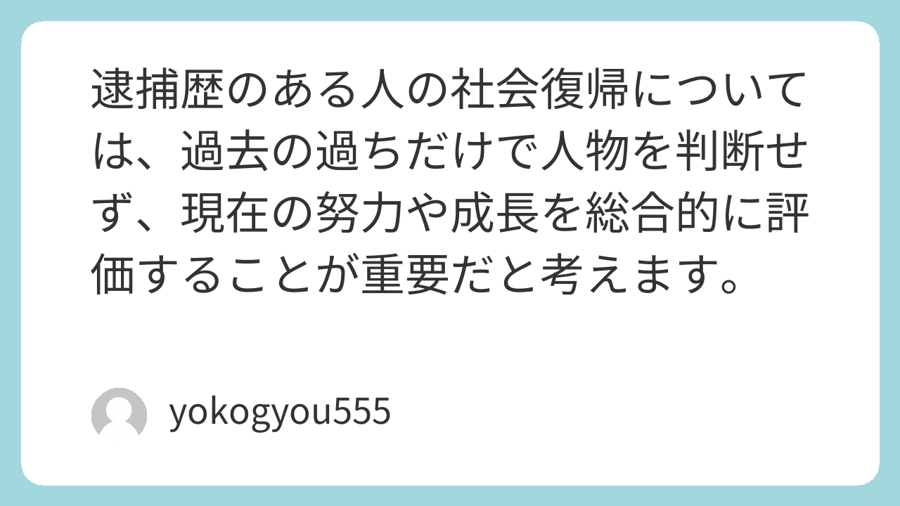 逮捕歴のある人の社会復帰については、過去の過ちだけで人物を判断せず、現在の努力や成長を総合的に評価することが重要だと考えます。