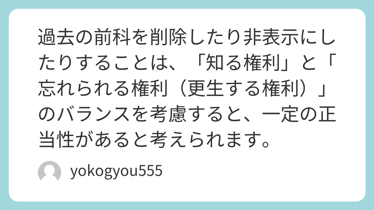 💪 過去に過ちを犯した人が社会復帰を目指す際、ネット上の情報が原因で就職先が見つからず、経済的に困窮して再び犯罪に手を染めてしまう(再犯)ケースも少なくありません。社会全体の治安を守るという意味でも、過去の記録によって社会から排除し続けるのではなく、更生のチャンスを与えるべきだと思いますか?あなたの考えを教えてください。